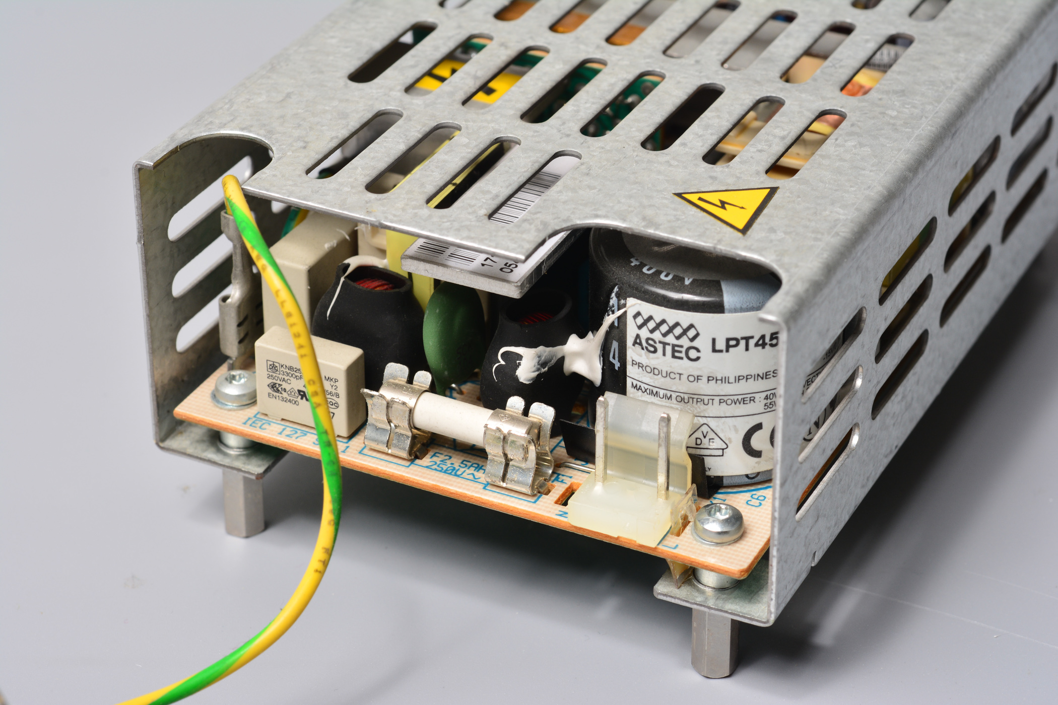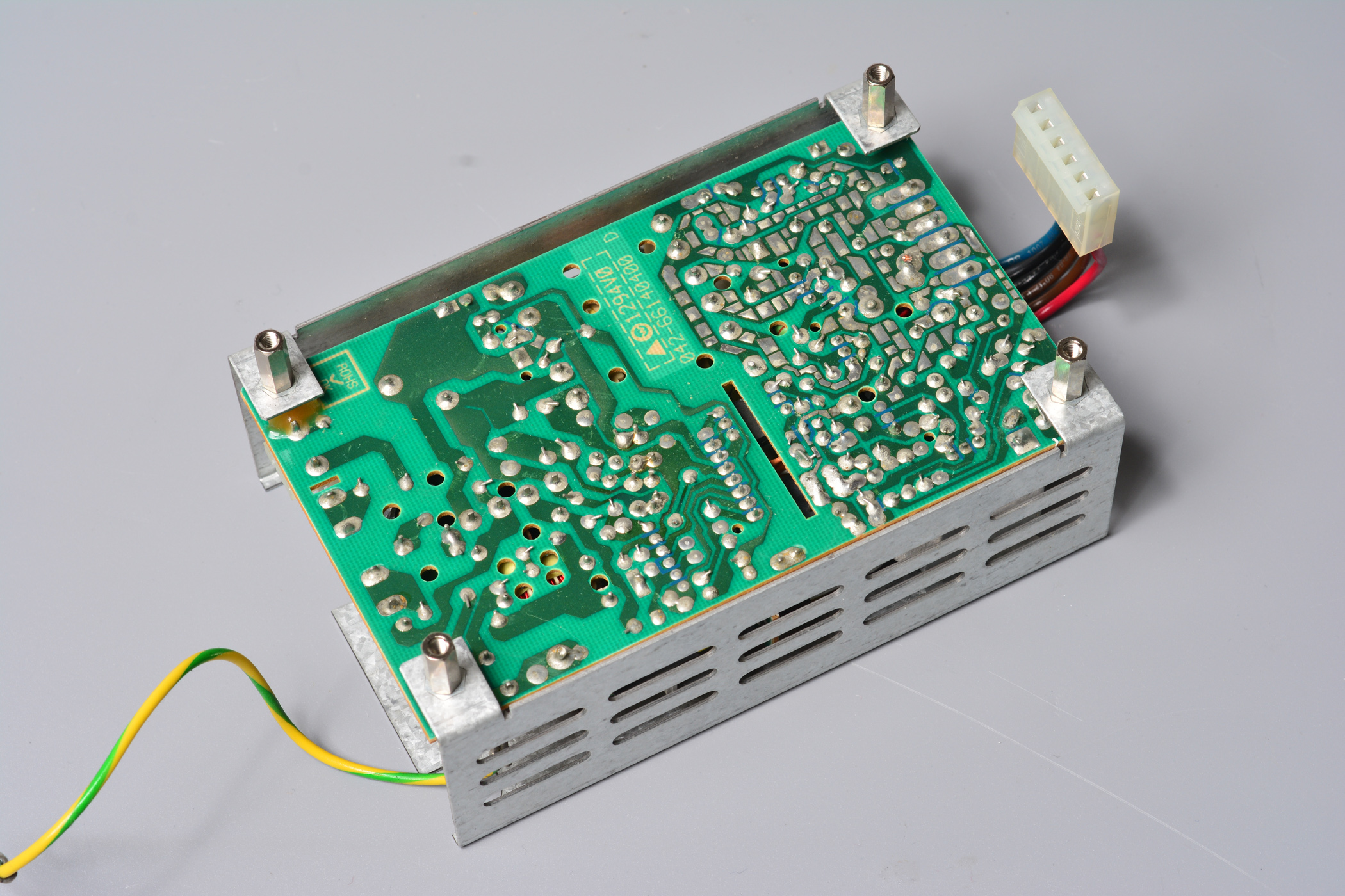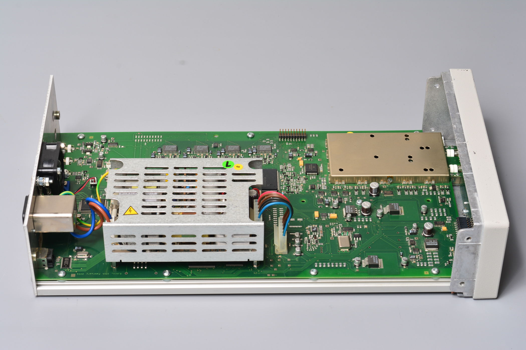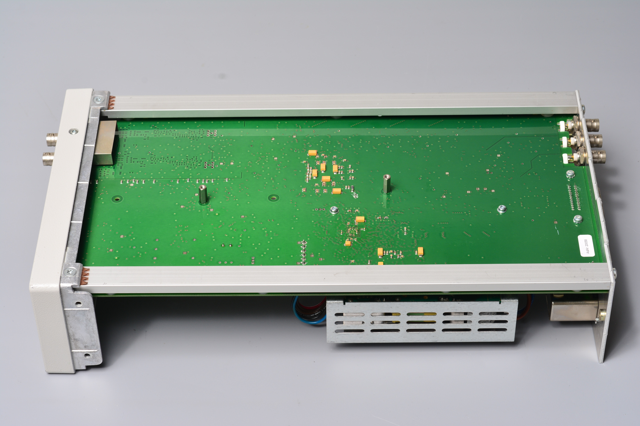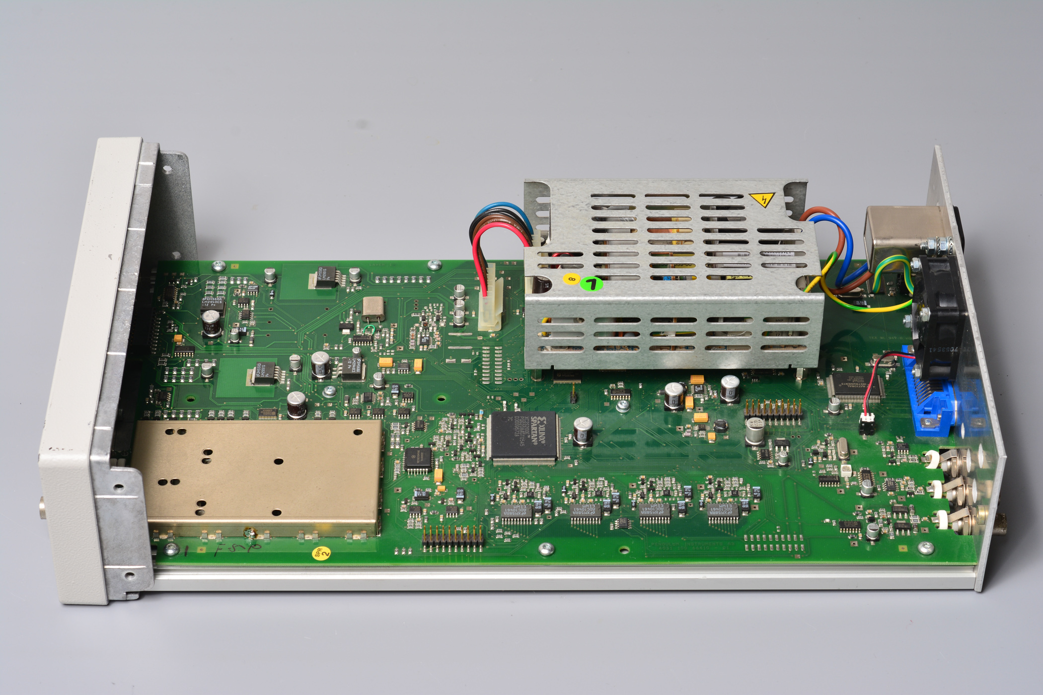 1.经过长年开机后,风扇已经磨损且噪声相当高,原机风扇是高转速型的,即便是全新的噪声也很大。经过测量该频率计开机时输入功率约20W(无OCXO),其内部的开关电源在自然散热条件下标称有40W的负载能力,PCB上除了一个ECL电路之外似乎也没有温度较高的器件。因此最后把风扇换成了较为安静的型号。