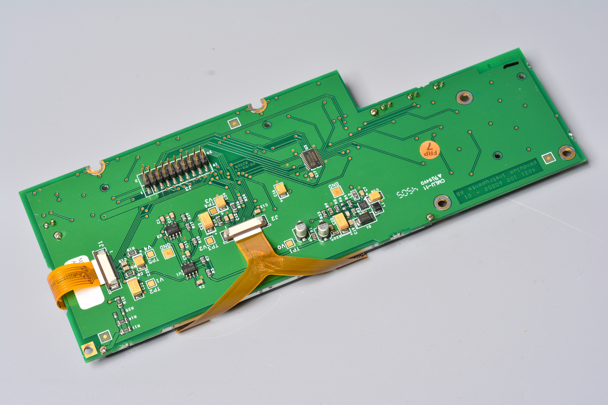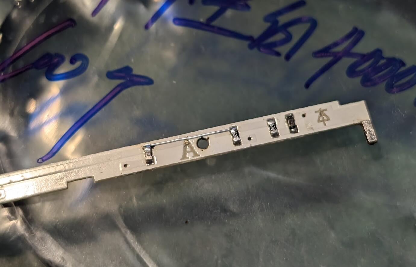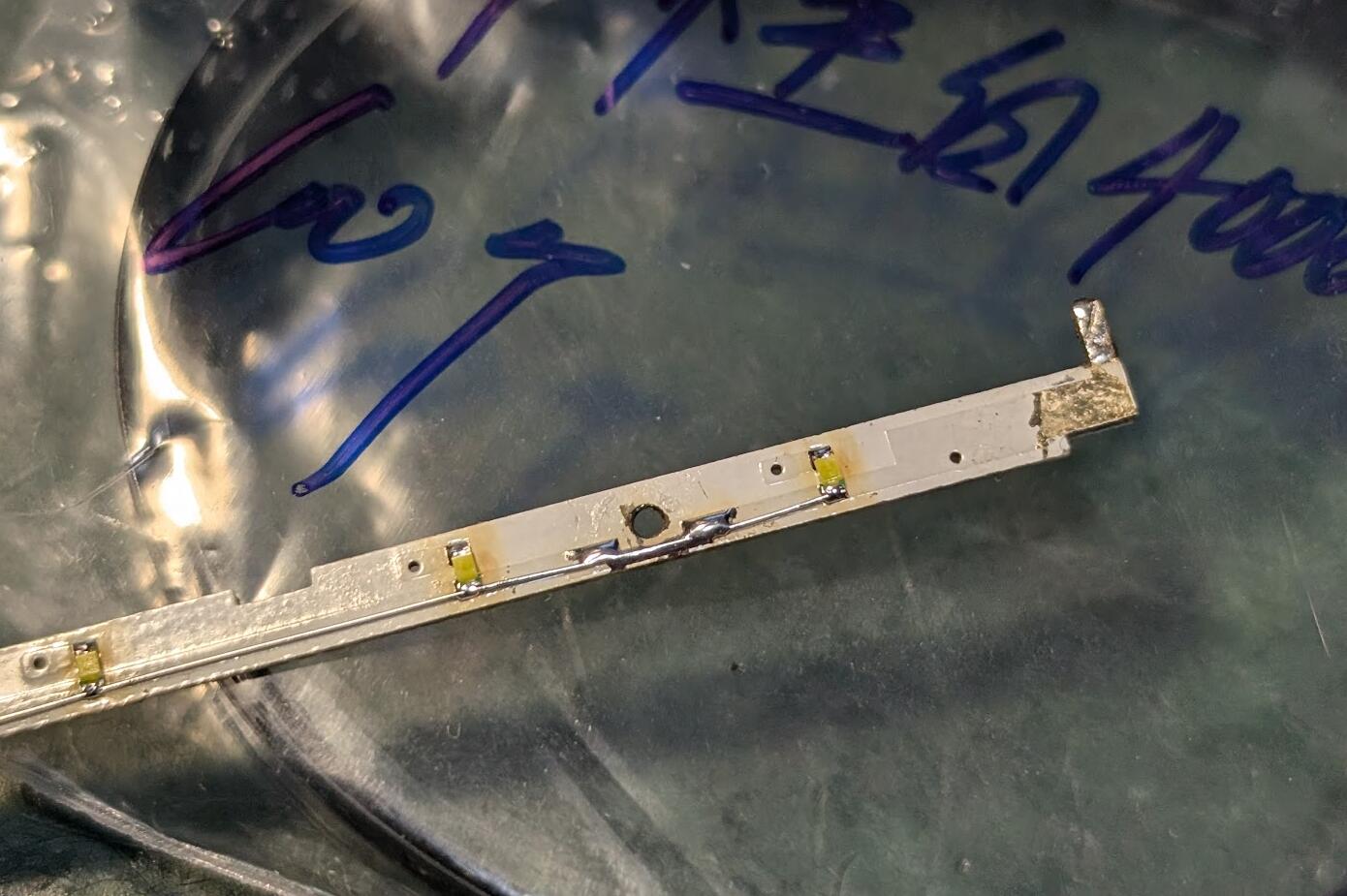 经过测量背光灯条发现其中一处开孔上方的PCB走线有不可见的裂痕,稍微弯曲灯条所有LED灯珠发光,而走线断裂时只有位于断点之前的唯一一个灯珠发光。因此用铜丝加固了所有走线。